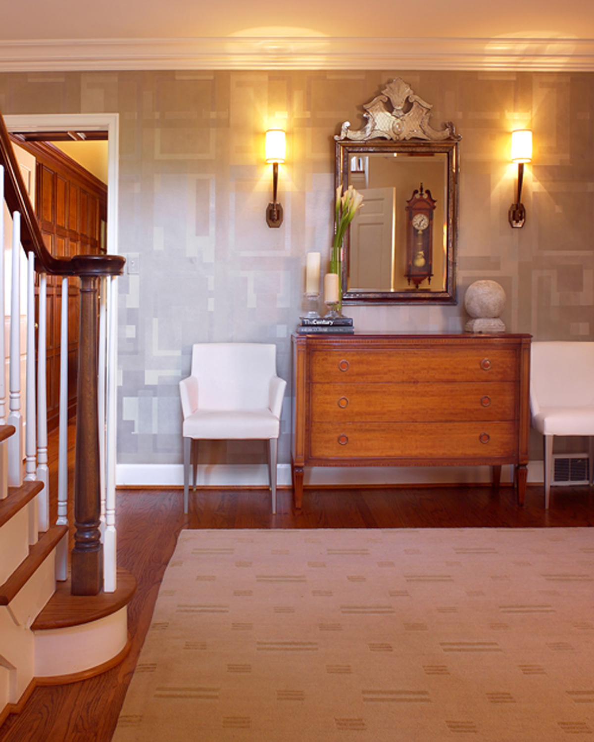 A foyer should make a statement and set a tone for the rest of the house; it’s the first thing guests see. We took cues from this home’s straight-lined Georgian colonial architecture, and made a focal wall of layered paper squares and rectangles. We contrasted it with sculptural pieces like the sconces and a Venetian mirror we found in San Francisco . More squares in the Tibetan rug and the contemporary Italian chairs flanking the Regency commode tie the space together.
